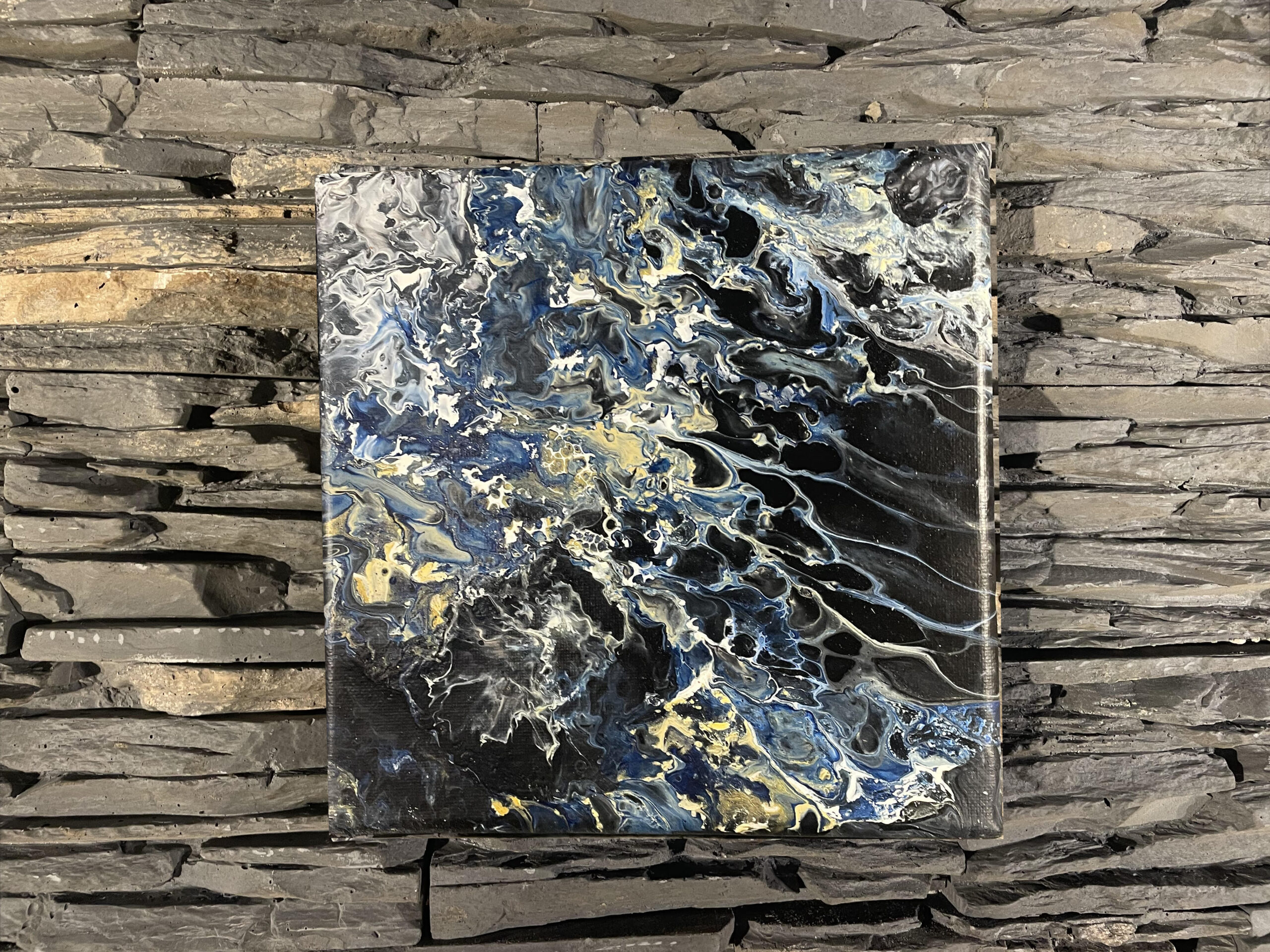 This piece explores the tension between chaos and flow, with sweeping movements of deep navy, black and soft gold interacting across the canvas. The composition suggests powerful natural forces like ocean currents or tectonic shifts frozen in a single moment. Created using acrylic pour techniques, the painting develops intricate cellular textures and layered depth organically, making every detail completely unique. Details: Size: 20cm x 20cm Medium: Acrylic on canvas Original: One-of-a-kind artwork Signed: Yes A bold, atmospheric piece that works beautifully as a focal point in modern interiors
