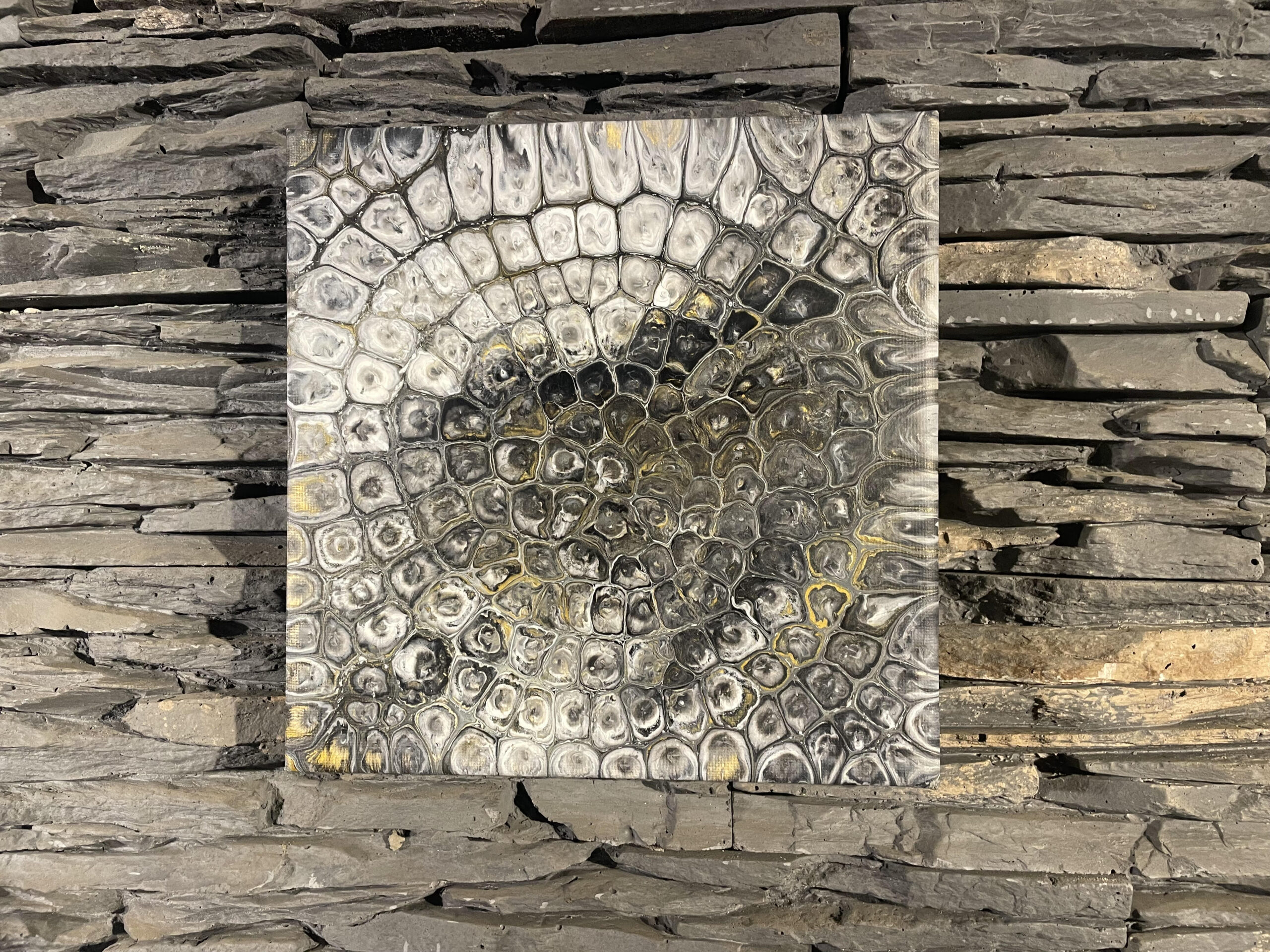 This piece explores natural pattern formation, with layered cellular structures radiating outward in earthy tones of grey, black and subtle gold. The composition evokes the appearance of fossilised forms or mineral growth, blending organic rhythm with a grounded, tactile aesthetic. Created using acrylic pour techniques, the painting develops intricate cell-like textures and depth naturally, ensuring every detail is completely unique. Details: Size: 20cm x 20cm Medium: Acrylic on canvas Original: One-of-a-kind artwork Signed: Yes A subtle yet highly detailed piece, ideal for contemporary interiors with a natural or industrial style.