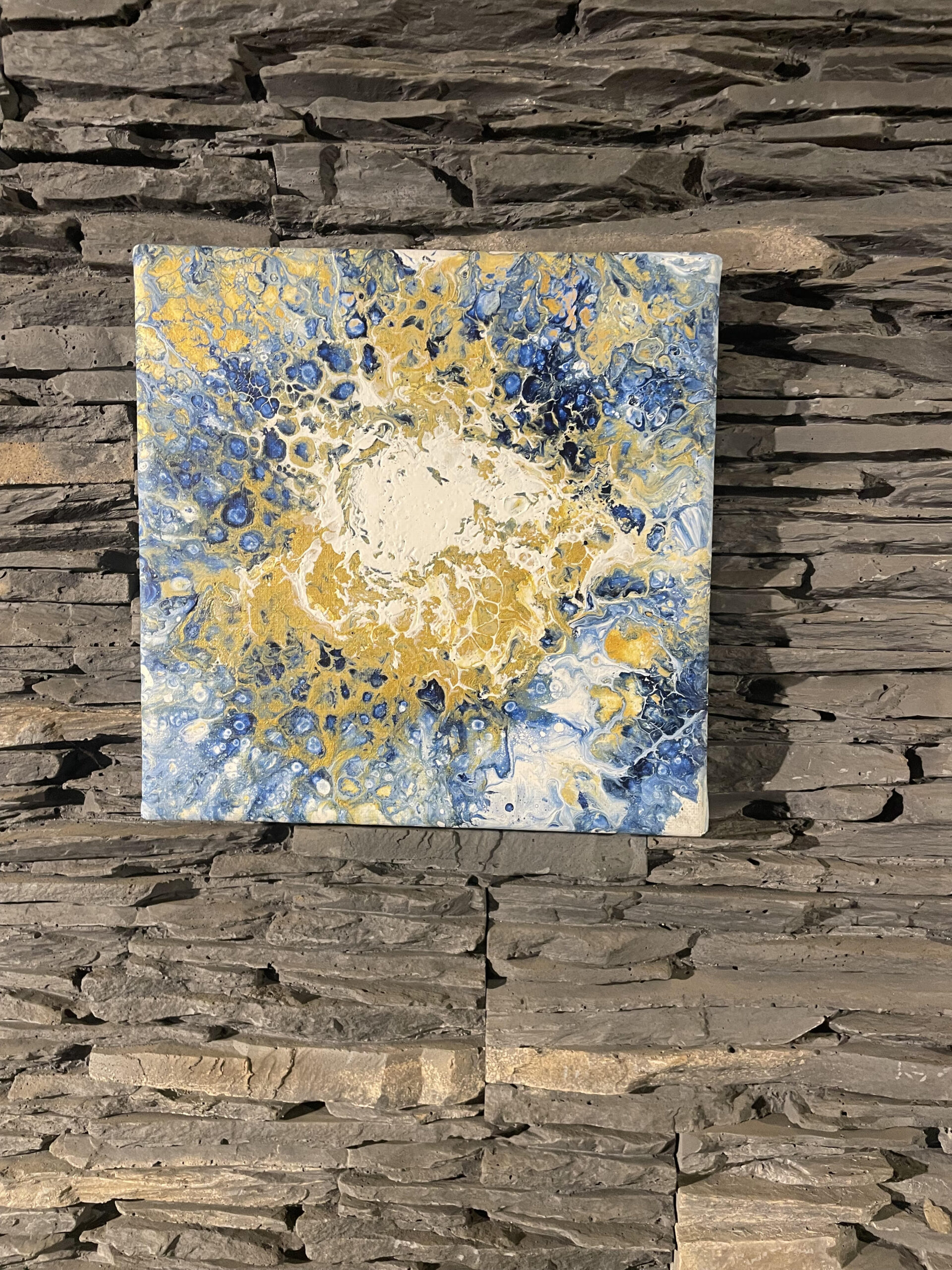 This piece captures a moment of outward energy, with a bright central form radiating into rich blues and warm gold tones. The composition suggests a burst of light or a natural expansion, blending movement with intricate cellular detail. The contrast between the luminous centre and the surrounding textures creates depth and draws the eye inward, while the organic patterns add complexity and uniqueness across the surface. Created using acrylic pour techniques, the painting naturally forms detailed cells and layered textures, ensuring no two areas are ever the same. Details: Size: 20cm x 20cm Medium: Acrylic on canvas Original: One-of-a-kind artwork…